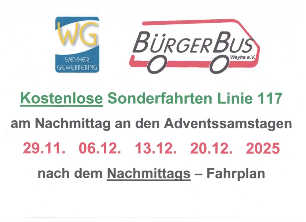 Der Bürgerbus Weyhe e.V. bietet in Zusammenarbeit mit dem Weyher Gewerbering auch dieses Jahr wieder kostenlose Fahrten an den vier Adventssamstagen an.