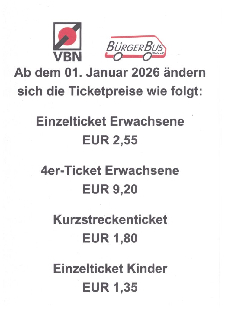Zum 1. Januar 2026 werden die Ticketpreise im VBN-Bereich, an dem auch wir gebunden sind, leicht erhöht, in unserem Bereich um 10 Cent pro Fahrt.